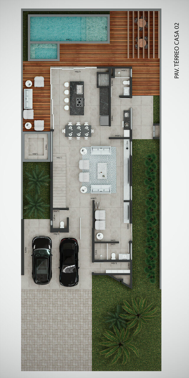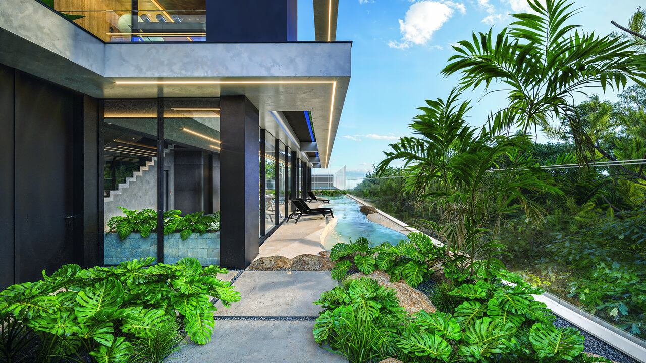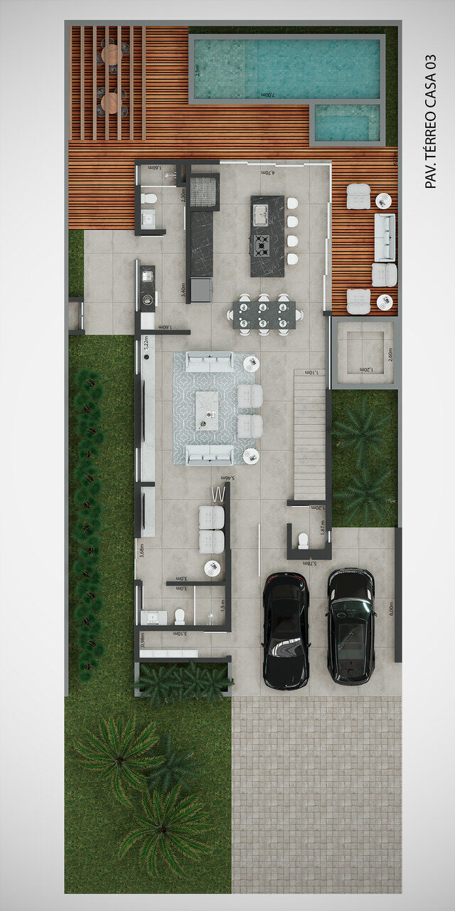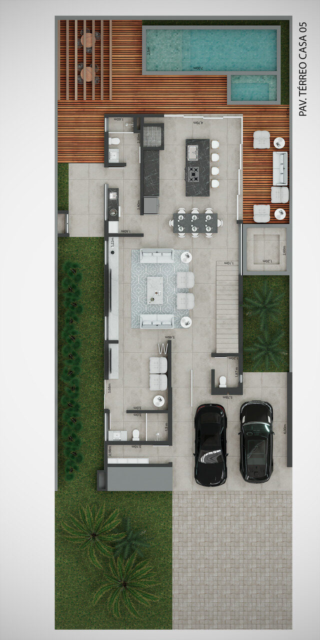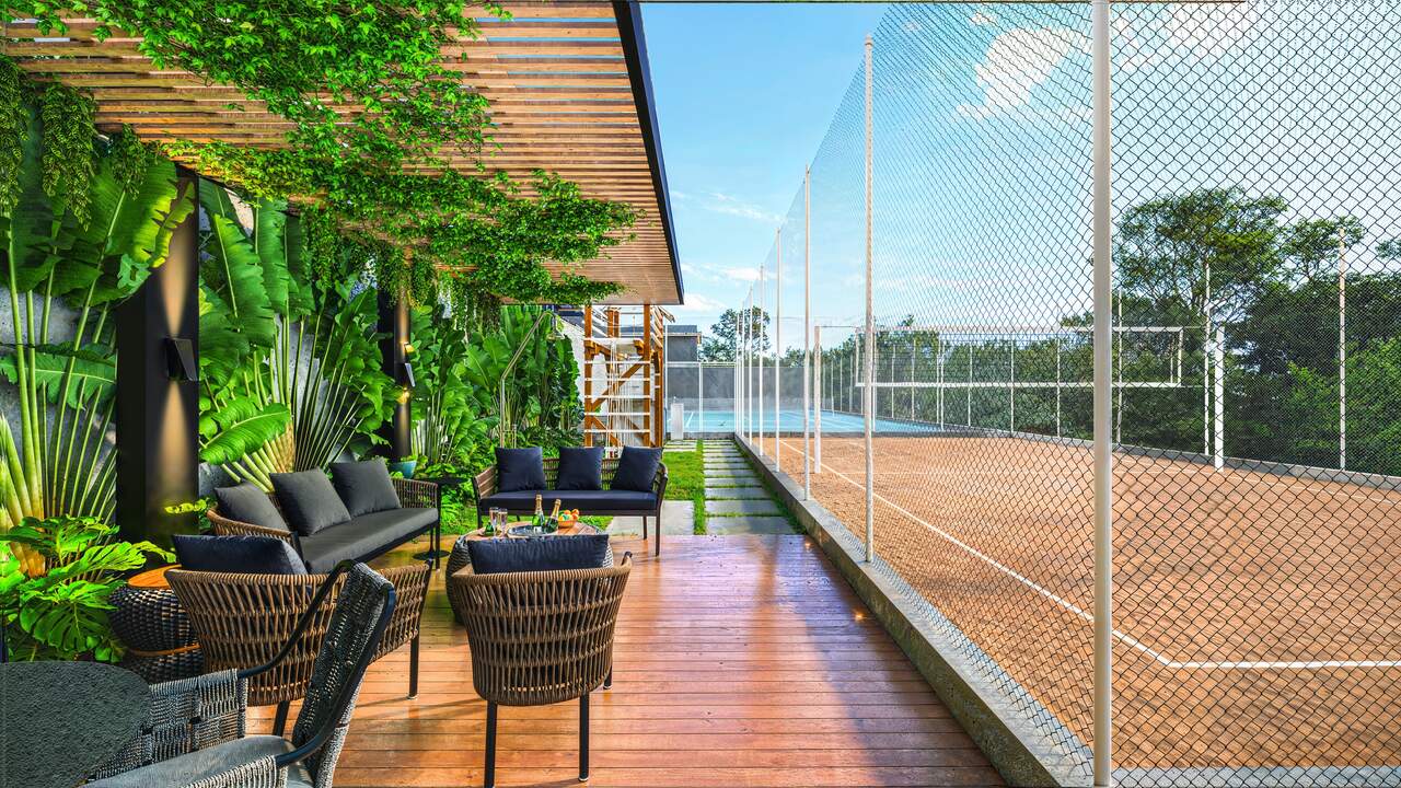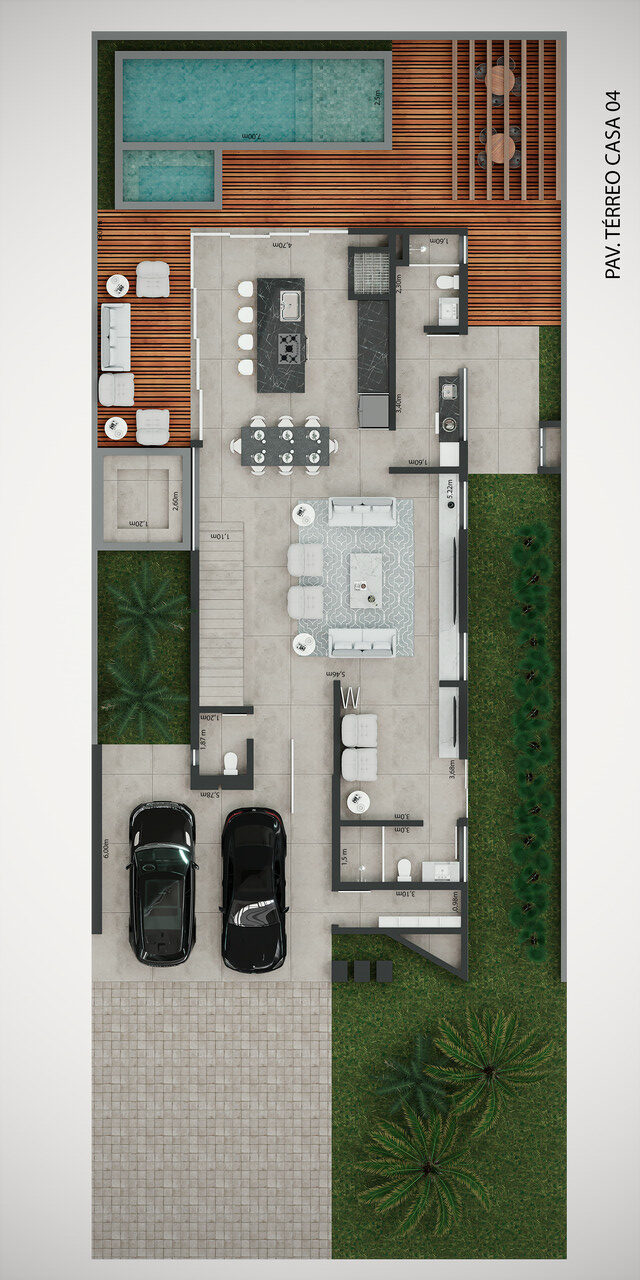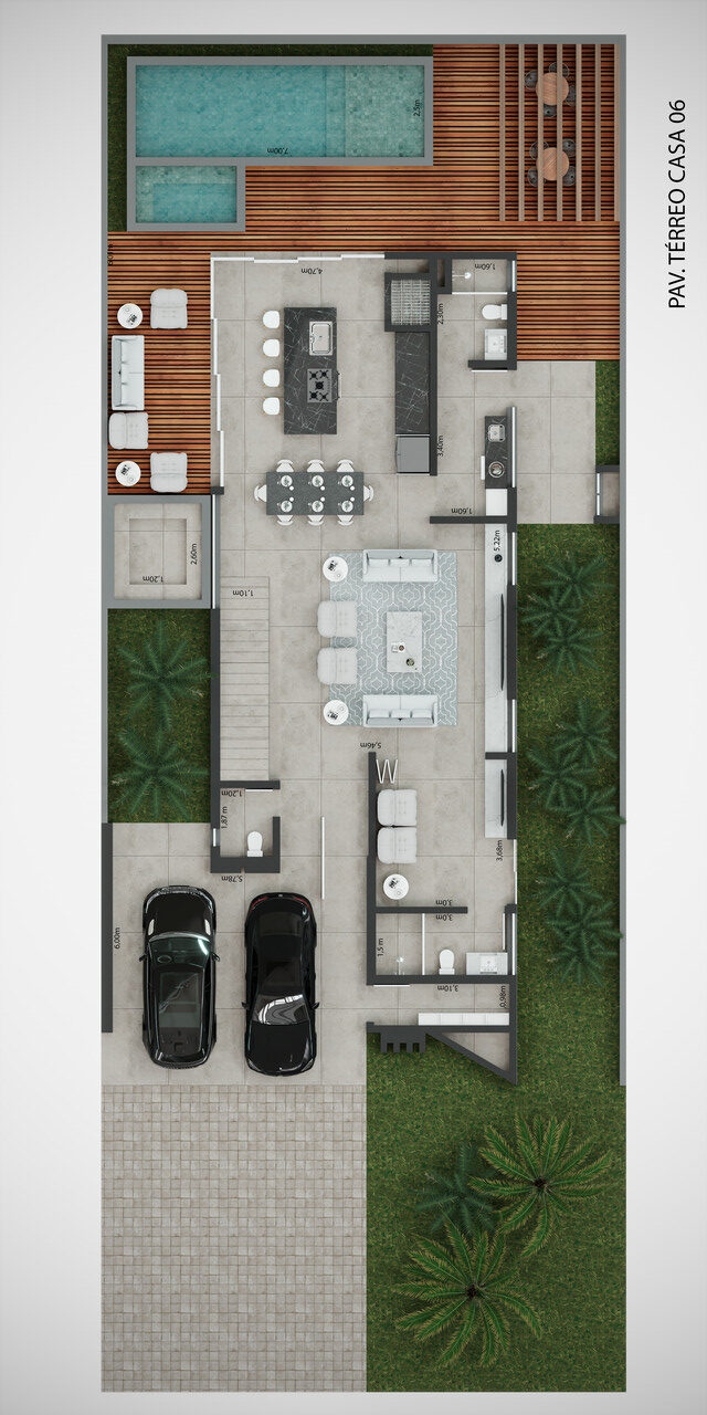 “Como o empreendimento faz divisa com o campo de golf, cada casa assinada tem a sua identidade própria, inspirada em um tipo de jogada , gerando a conexão entre o projeto com o contexto do entorno. Foi pensado para cada usuário ter a experiência no uso da sua casa com a sua família contando com uma área de lazer completa somando com o clube privativo. Arquitetura contemporânea com o uso de materiais e texturas exclusivas para viver experiências únicas”