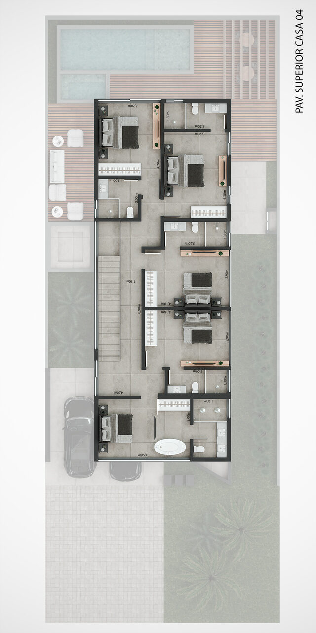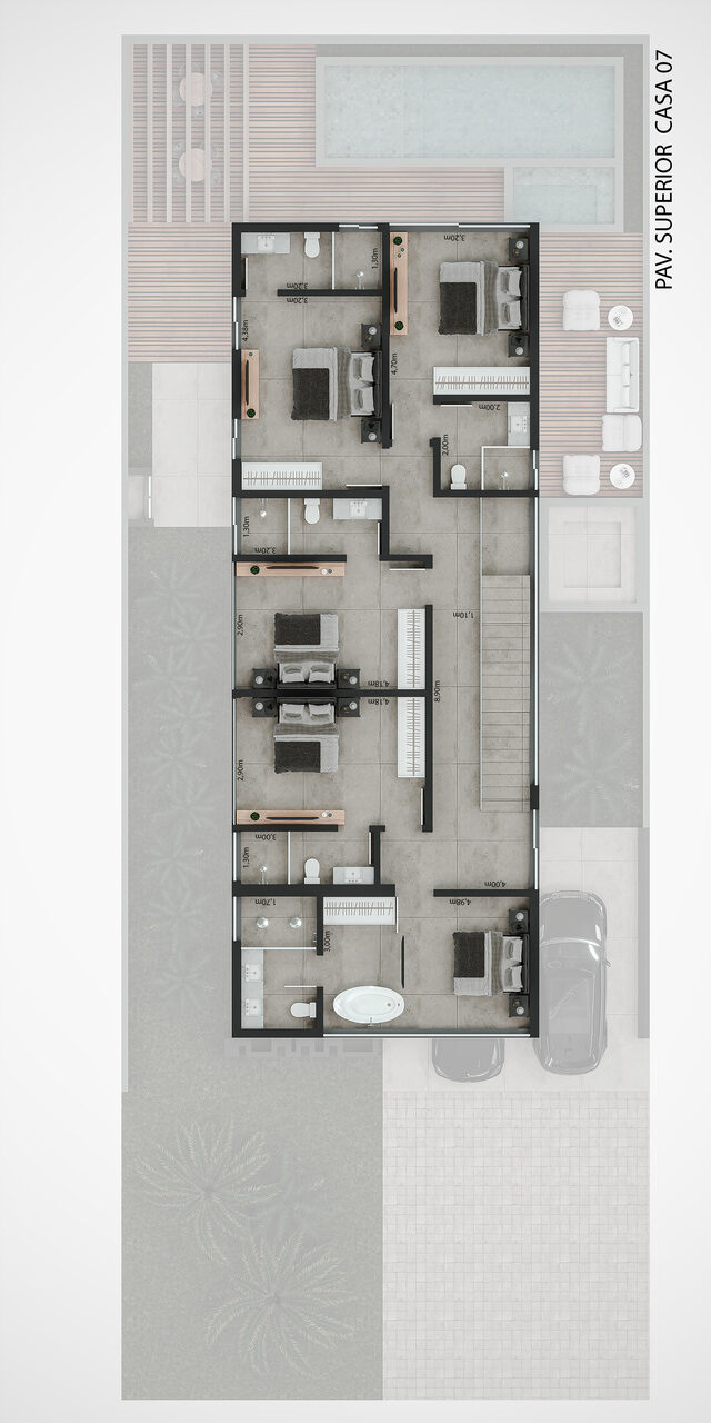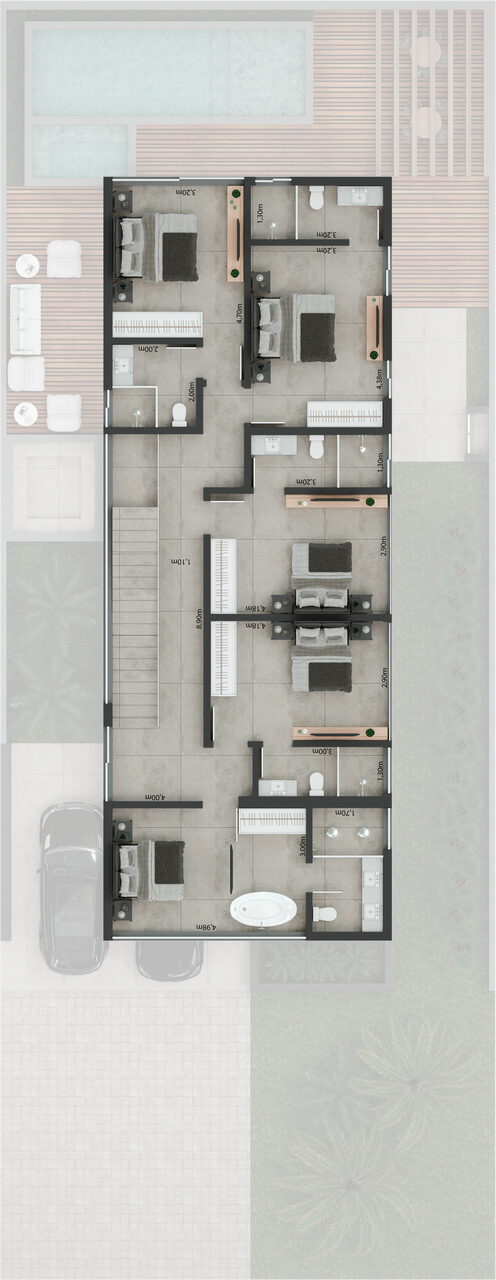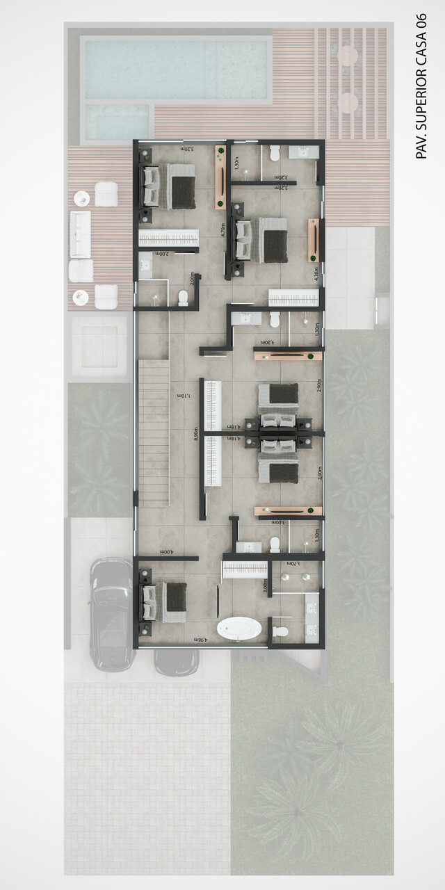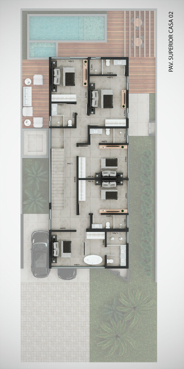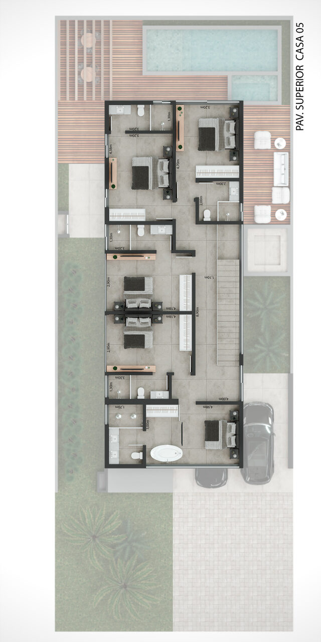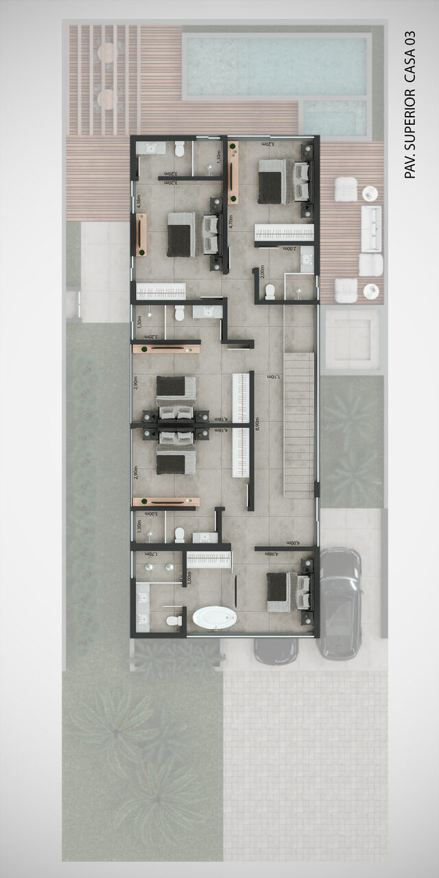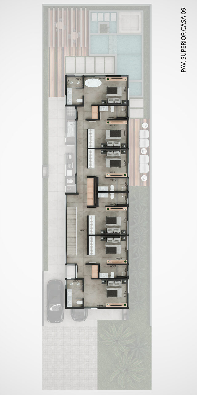 “Como o empreendimento faz divisa com o campo de golf, cada casa assinada tem a sua identidade própria, inspirada em um tipo de jogada , gerando a conexão entre o projeto com o contexto do entorno. Foi pensado para cada usuário ter a experiência no uso da sua casa com a sua família contando com uma área de lazer completa somando com o clube privativo. Arquitetura contemporânea com o uso de materiais e texturas exclusivas para viver experiências únicas”