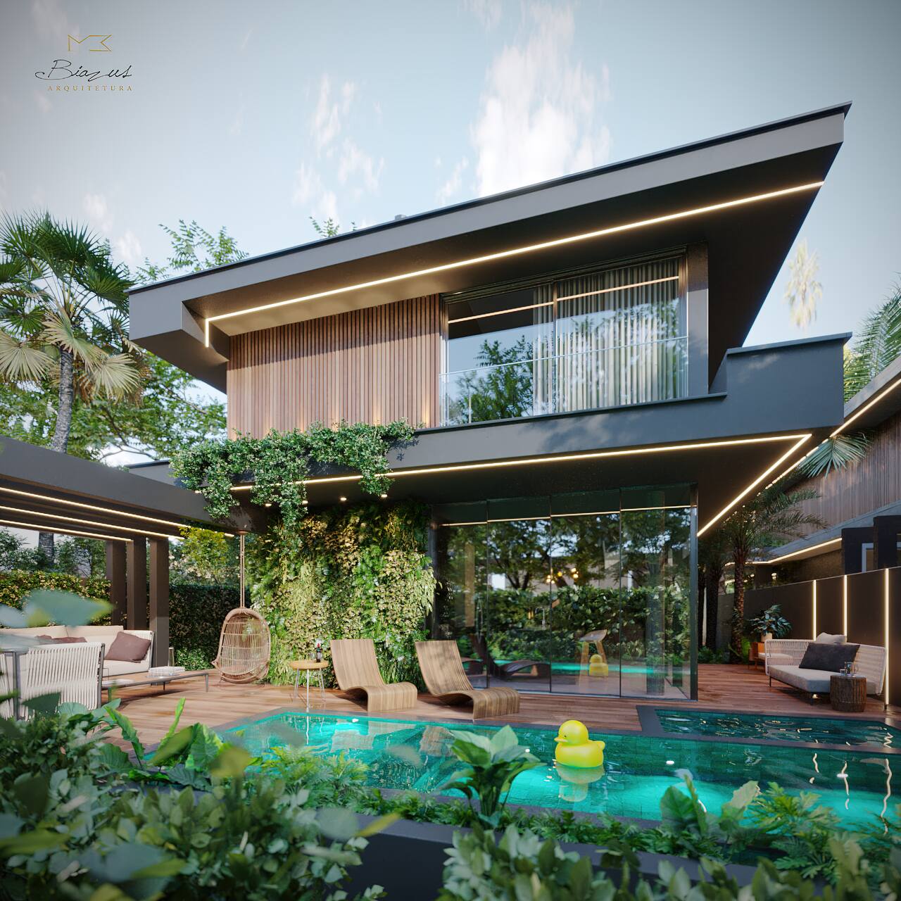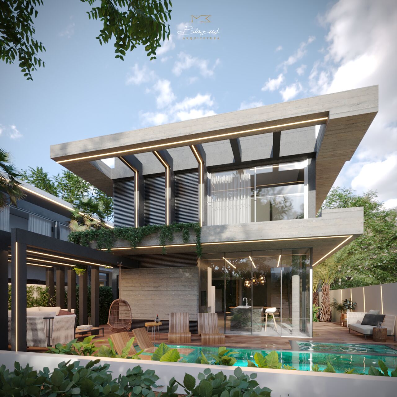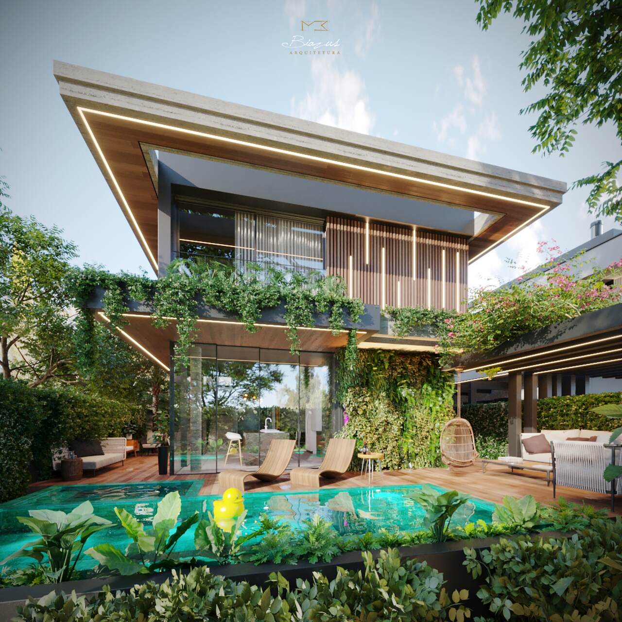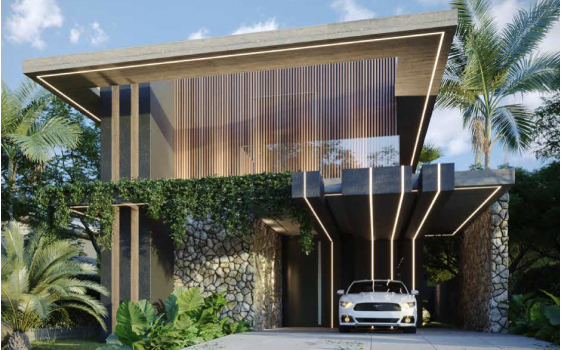 “Como o empreendimento faz divisa com o campo de golf, cada casa assinada tem a sua identidade própria, inspirada em um tipo de jogada , gerando a conexão entre o projeto com o contexto do entorno. Foi pensado para cada usuário ter a experiência no uso da sua casa com a sua família contando com uma área de lazer completa somando com o clube privativo. Arquitetura contemporânea com o uso de materiais e texturas exclusivas para viver experiências únicas”